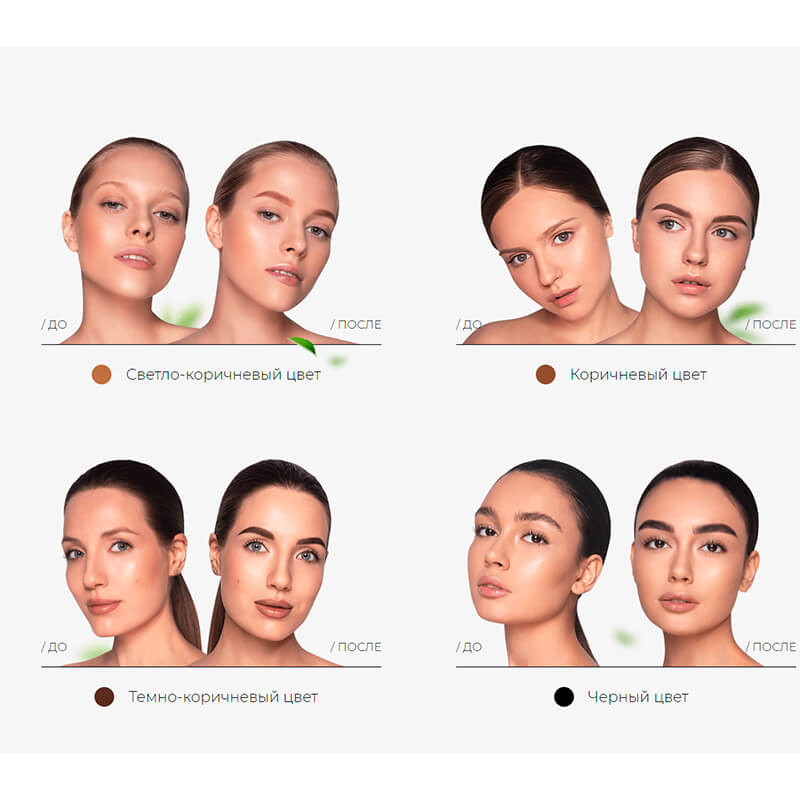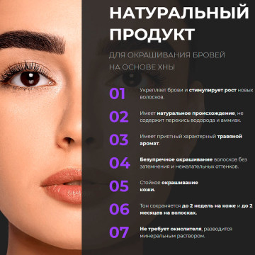 Хна окрашивает кожу и волоски. Пудровый эффект окрашивания сохраняется до 2 недель на коже и до 2 месяцев на волосках. Биотатуаж укрепляет брови и стимулирует их рост.